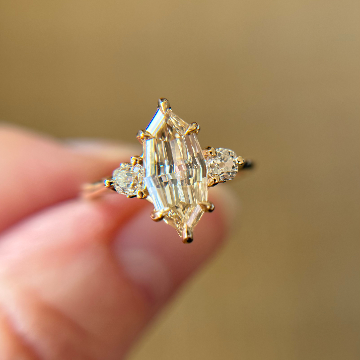 1.50ct Geo Step Cut Marquise Champagne Diamond. 0.31cttw Antique Old Mine Cut Diamond accents. Set in 14K yellow gold.