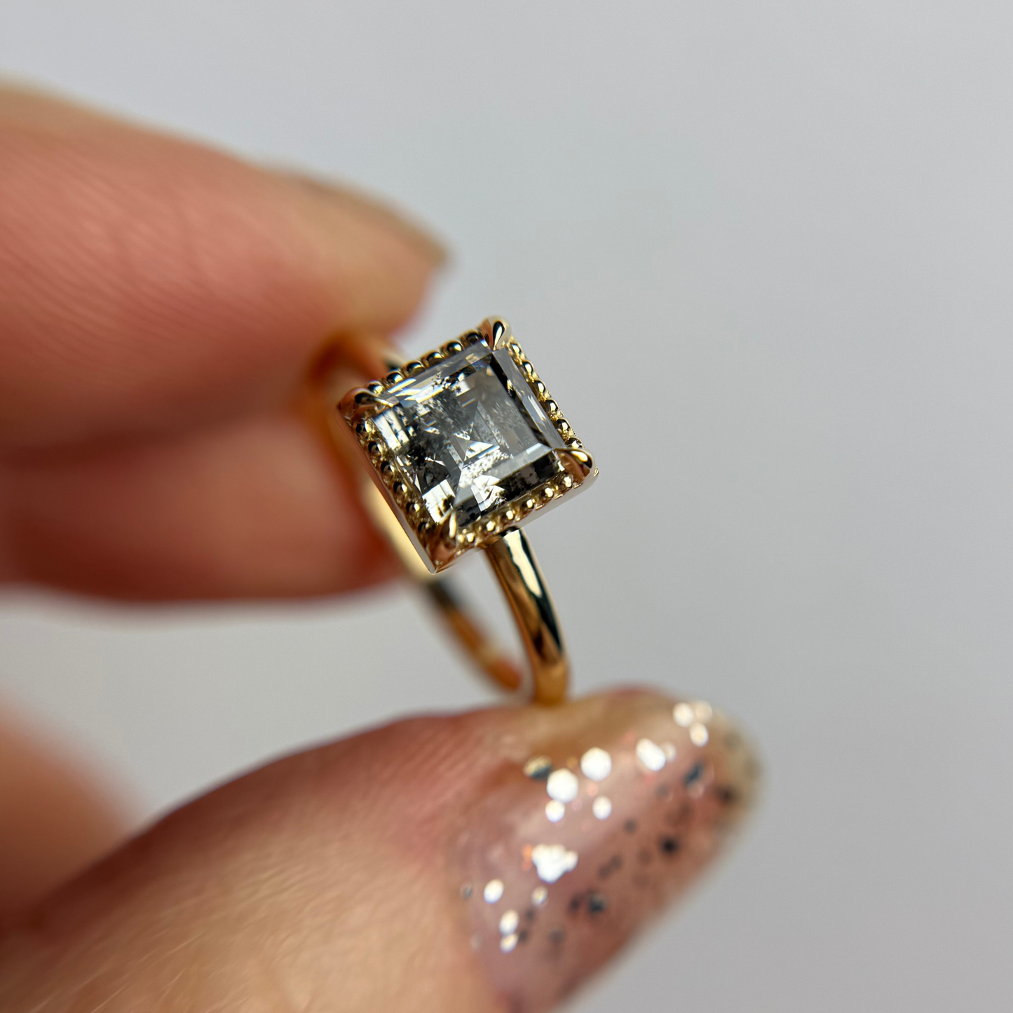 1.51ct Salt & Pepper Carré cut Canadian diamond sourced from the Gahcho Kué Diamond Mine of the Northwest Territories. Set in 14K yellow gold.