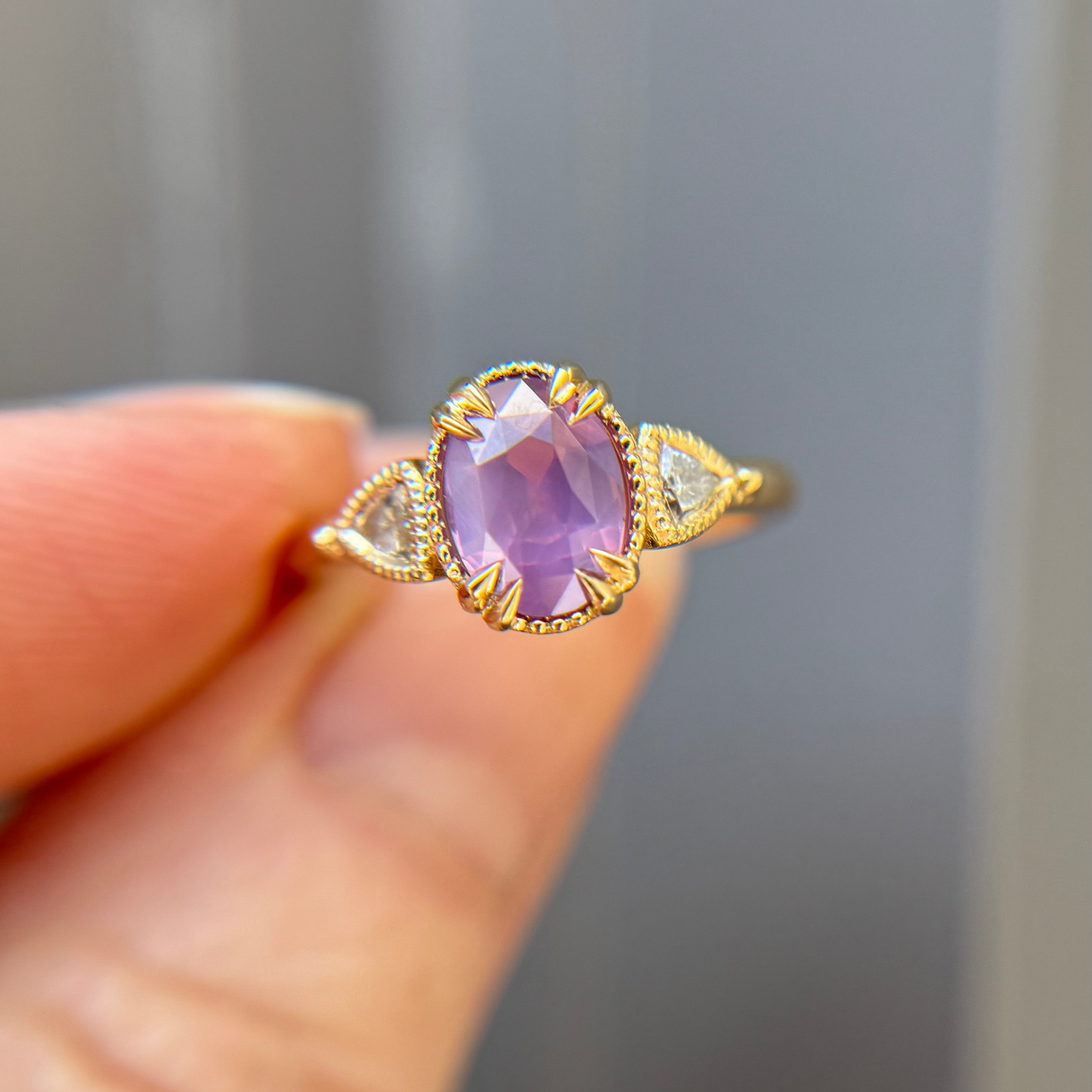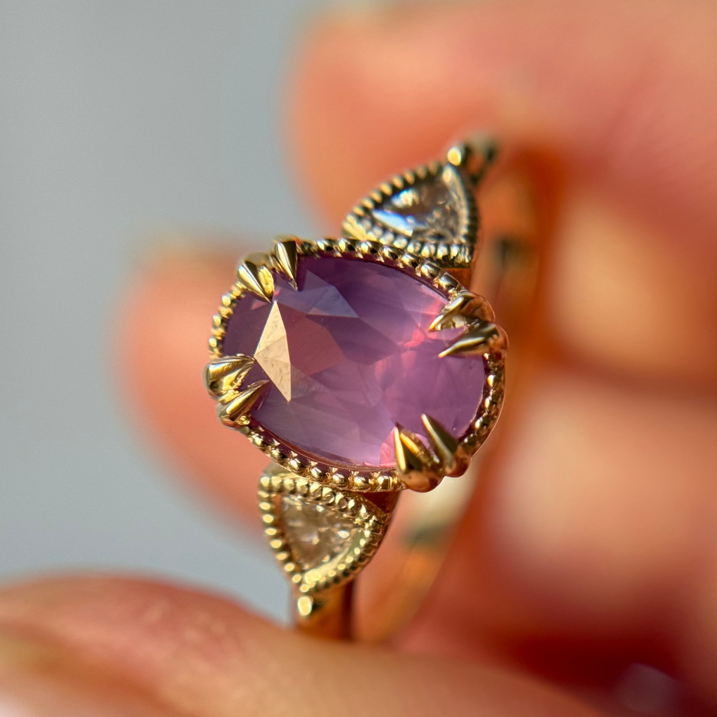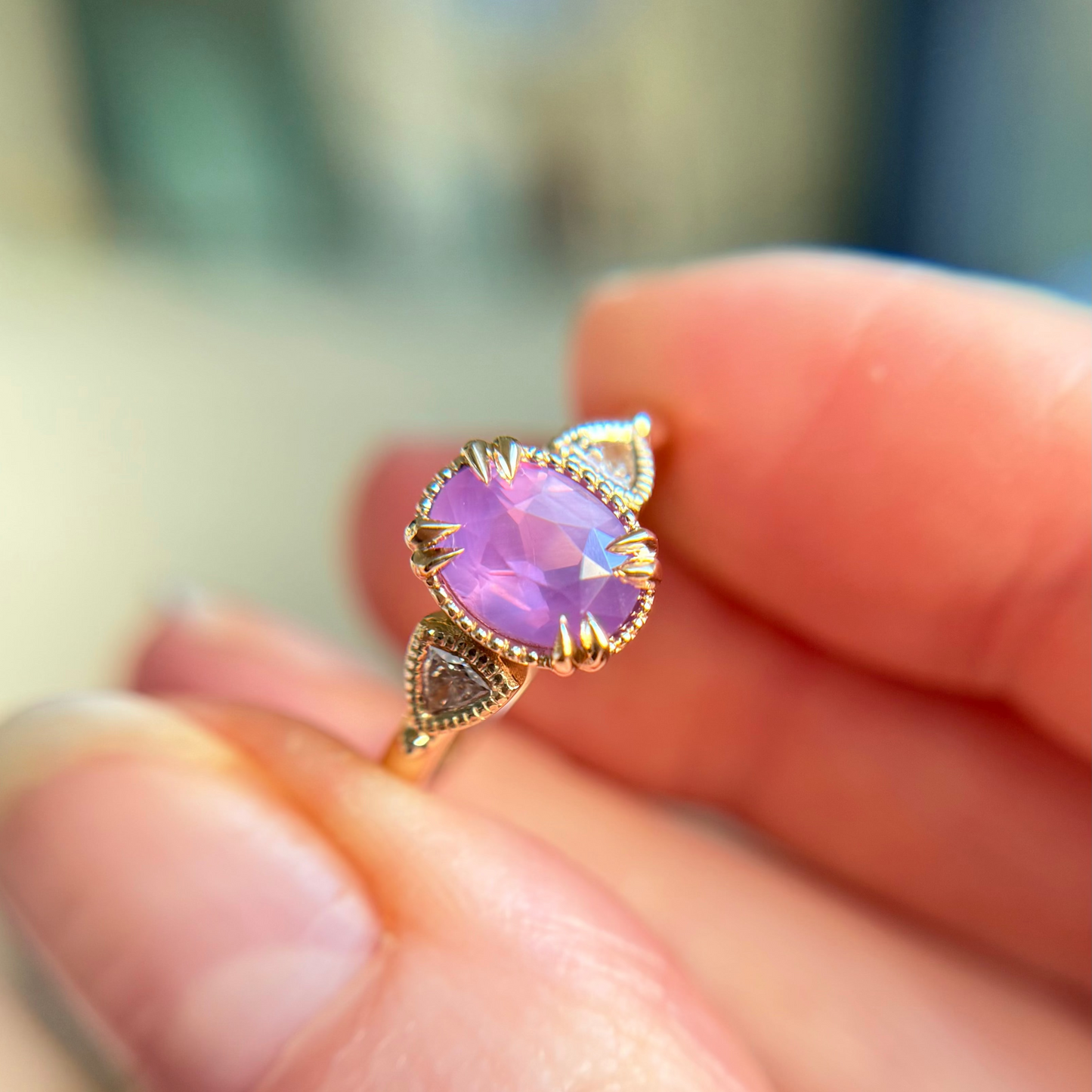 This Pink Sapphire Bicoastal ring is Jilian's nod to the 3-stone engagement ring symbolizing a couple's past, present and future. The centre stone is held securely in place with a milgrain detailed setting and claw-like prongs. Trillion diamond accent stones adds a touch of elegant whimsy.