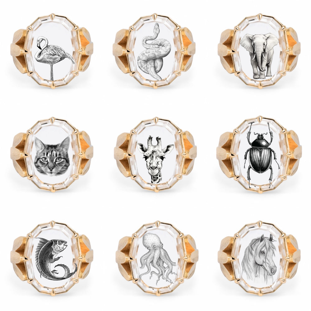 The Good Fortune Ring is one of Jilian's most unique and coveted designs. Like treasure from a world long forgotten, this chunky ring features a custom cut portrait sapphire resembling a pane of glass, acting as a window through which to marvel at the special hand carved motif below. The result is a bright and airy statement piece like nothing you've ever worn before.