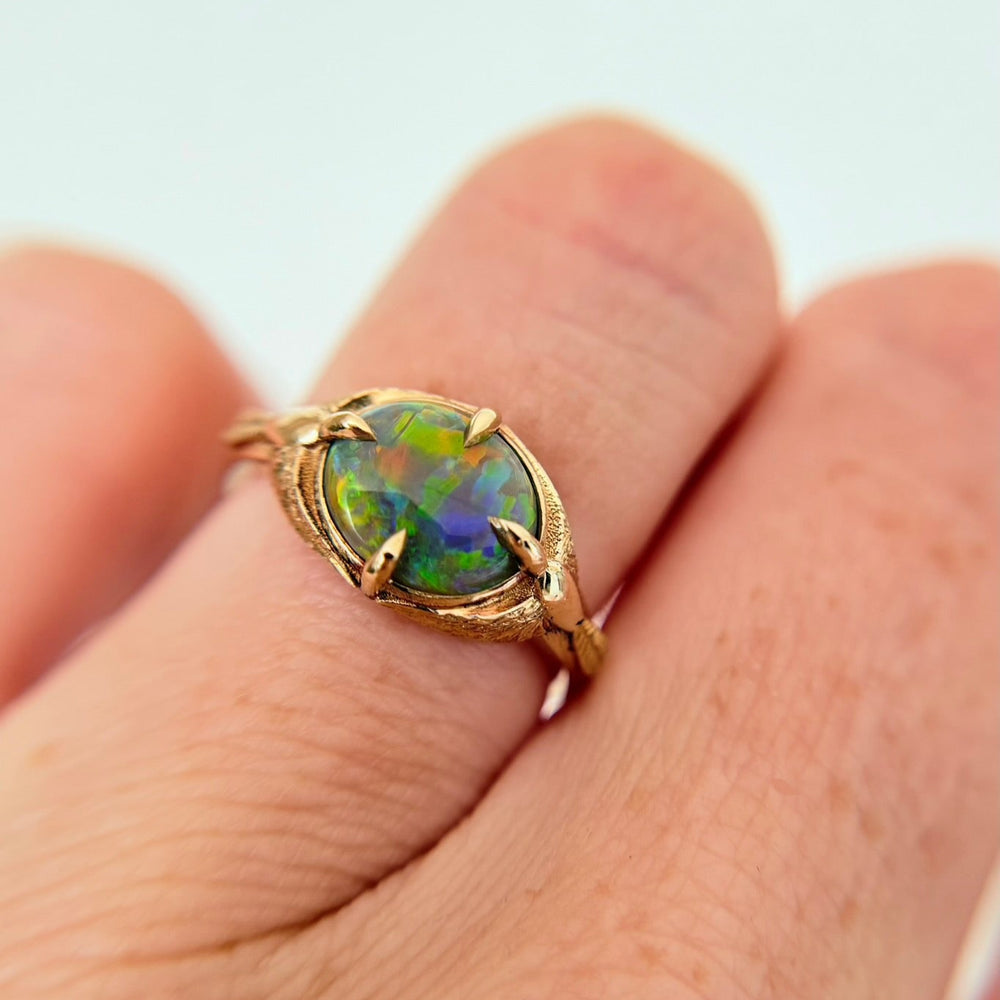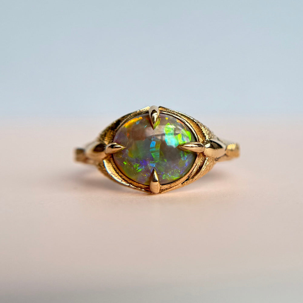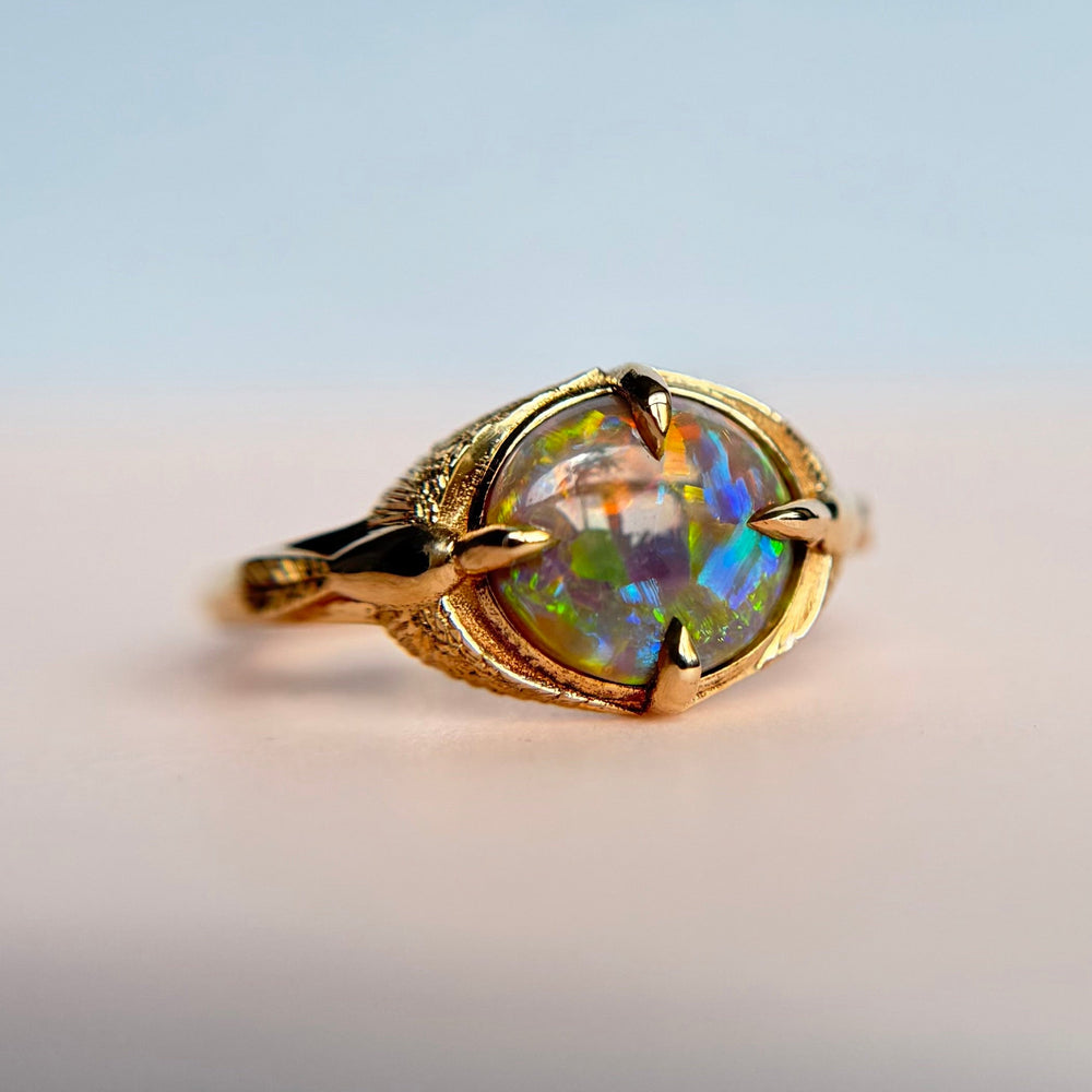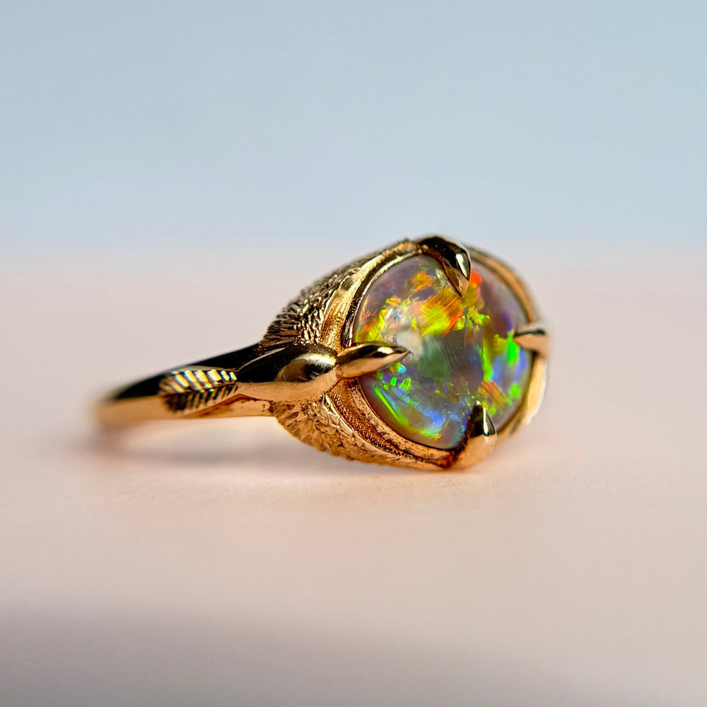 Cast in 14K gold, the ring's design begins with a central Opal - known for its dazzling, shifting fire, the Opal mirrors the unpredictable journey and the magic of fairy dust. On either side, two hand-engraved birds symbolize the thrill of flight and the freedom of spirit. They are your invitation to take wing, and carry the magic of Pari with you wherever you wander.